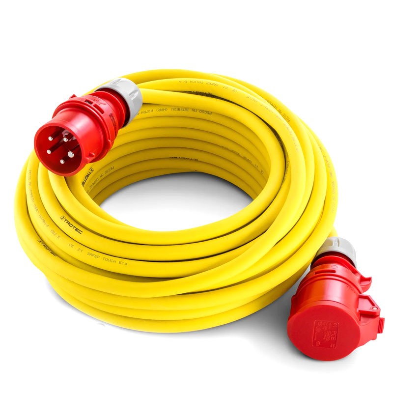 D'un point de vue technique, la rallonge professionnelle Trotec est alimentée par un réseau triphasé de 400 V, avec un courant nominal de 32 A. D'une section de 6 mm², ce câble à 5 conducteurs de type H07RN-F garantit un indice de protection IP44, ce qui le rend adapté aux installations intérieures et extérieures dans des conditions climatiques difficiles. Sa gaine en néoprène jaune résiste aux températures comprises entre -25 °C et +60 °C , aux huiles, aux acides, aux rayons UV et à l'ozone, conservant ainsi sa flexibilité même dans des conditions critiques.