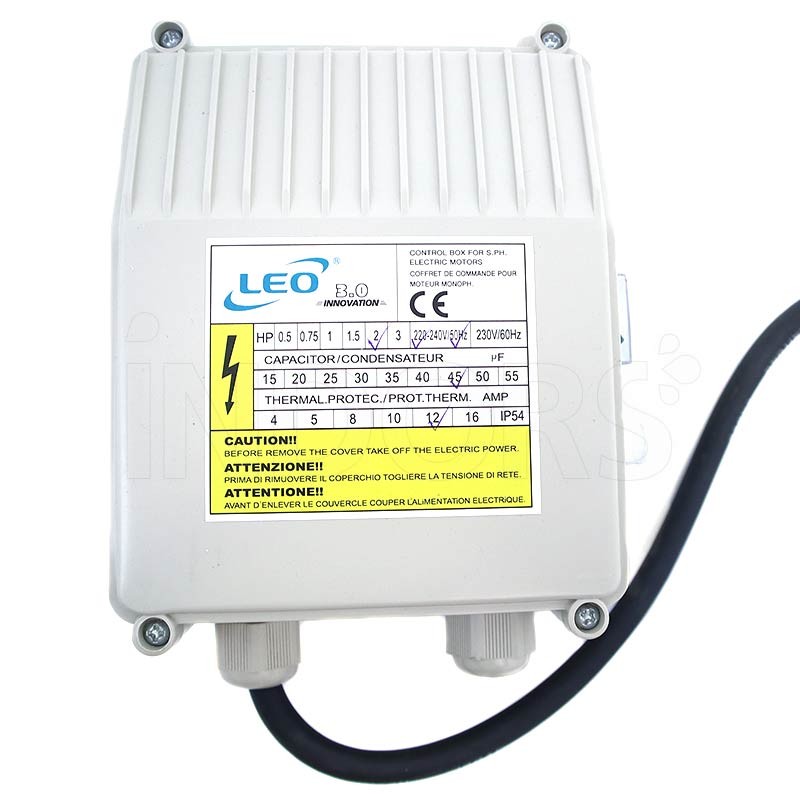 Avec une alimentation 230 V , le panneau électrique Leo 10BOX20 dispose d'une entrée normalement ouverte pour le contrôle de démarrage. Avec condensateur de marche pour connecter les pompes au réseau électrique, utile pour contrôler la phase de démarrage initiale de la pompe, prolonge la durée de vie de la pompe.