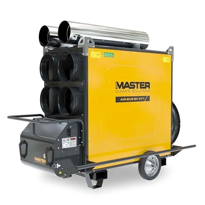 Le chauffage professionnel Air Bus Master BV 471S Il se compose d'un cadre en acier massif et d'une chambre de combustion en acier inoxydable. Le générateur d'air chaud portable BV 471 S repose sur des roues robustes et comprend 4 crochets solides pour le levage : ces générateurs Air Bus sont facilement transportables. Le brûleur Riello est séparé.