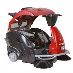 Cette balayeuse autoportée est capable de travailler sur des pentes de 12 % et récupère les débris dans un grand tiroir à déchets de 65 L. Sa vitesse d'avancement est de 5,2 km/h .