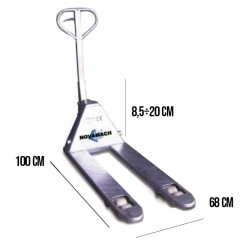 Le transpalette en acier inoxydable Novamach présente une hauteur minimale de 8,5 cm et maximale de 20 cm , avec une capacité allant jusqu'à 2 500 kg . Les versions disponibles se distinguent par la taille et le nombre de rouleaux : vous avez le choix entre des modèles à 1 ou 2 rouleaux en nylon et des largeurs de fourches de 54 à 68,5 cm . Son poids moyen est de 75 kg , garantissant une structure solide et maniable.