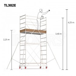 Échafaudages Gierre modèles TL302E , TL303E , TL304E. Tours mobiles professionnelles en acier très légères et faciles à assembler et à déplacer. Grâce à la base auto-assemblante, ils peuvent être installés par un seul opérateur . Convient aussi bien à un usage intérieur qu'extérieur et sans besoin d'ancrage au mur grâce au respect des normes EN1004-1 et EN1004-2 par les stabilisateurs.
