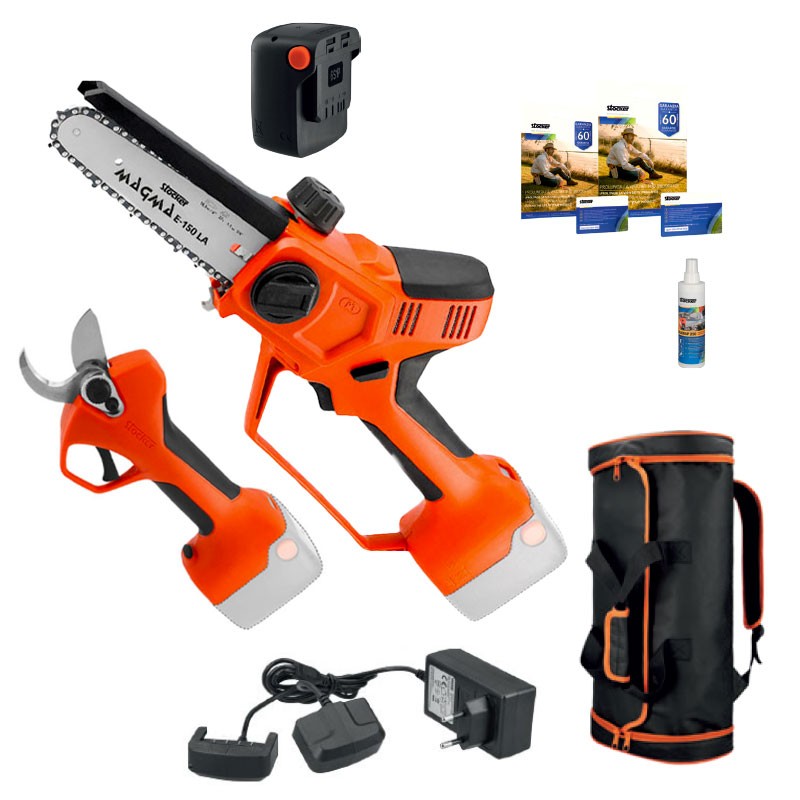 Ce KIT PROMO Stocker est composé de la tronçonneuse E-150 LA 21 V , du sécateur Magma E-35 TP 21 V et de la batterie 21 V 2,6 Ah compatible avec toute la gamme Stocker.