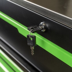 Les tiroirs sont équipés de glissières à billes de 45 mm avec retour automatique, qui assurent un coulissement fluide et une fermeture contrôlée, réduisant l'usure et améliorant la sécurité d'utilisation dans l'atelier.