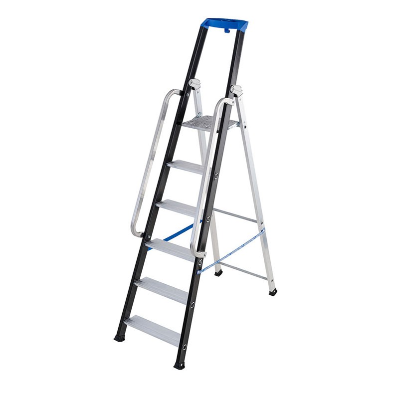 L'échelle est équipée d'un plateau de rangement pratique avec un espace pour les outils. Cela permet de garder les mains libres pendant le travail et de ne pas avoir à occuper l'espace de la plateforme en y plaçant des objets dont la chute pourrait être dangereuse et/ou problématique.