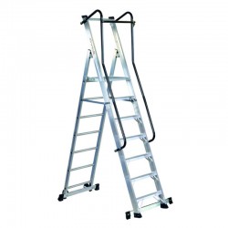 L'échelle professionnelle Svelt Moby est dotée de garde-corps de 80 cm sur les quatre côtés, de 2 roues d'un diamètre de 125 mm, de mains courantes peintes, d'une étagère de rangement, d'une plateforme renforcée de 43 x 44 cm et d'une barre de verrouillage de sécurité arrière pour un verrouillage stable et une utilisation en toute protection.
