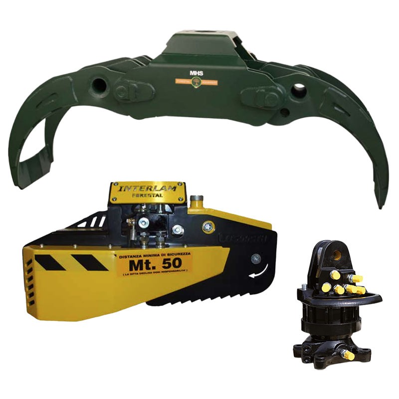 Kit forestier complet pré-assemblé MHS, composé d' un grappin forestier TMR 1400 , d'une tronçonneuse hydraulique IT 500 CTH et d'un rotateur hydraulique . Conçu pour l'abattage, le tronçonnage et la manutention de grumes professionnels, il est compatible avec les machines de 4 à 7 tonnes . Livré avec platine et système hydraulique intégrés, prêt à monter.