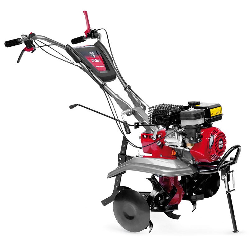 Cette motobineuse italienne est équipée d'une transmission directe à engrenages dans un bain d'huile, qui offre une résistance considérable aux contraintes sur terrains difficiles et nécessite peu d'entretien. Plus solide et fiable qu'une transmission par courroie, la transmission par engrenages a pour atout que tous les composants sont déjà en contact les uns avec les autres. La transmission latérale est assurée par une courroie , soutenue par une coque robuste .