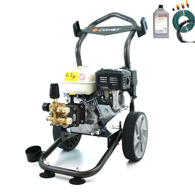 Ce nettoyeur haute pression Comet, alimenté par un moteur Honda, est équipé d'une pompe auto-amorçante Comet BDX avec 3 pistons axiaux en acier inoxydable et une tête en laiton .