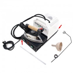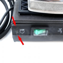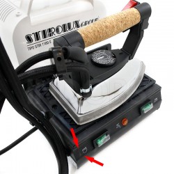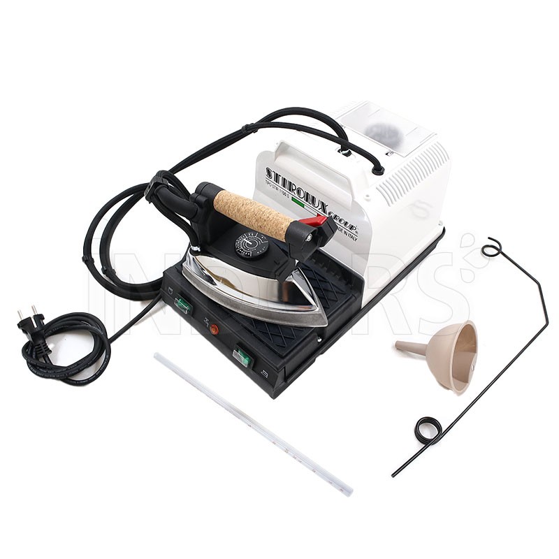 Ce fer à repasser est breveté et entièrement produit par la société Stirolux ; il est doté d'un thermostat à usage professionnel avec contacts en argent , de câbles de connexion électrique fabriqués avec des matériaux idéaux et adaptés à un usage professionnel et de contacts Faston en acier inoxydable .