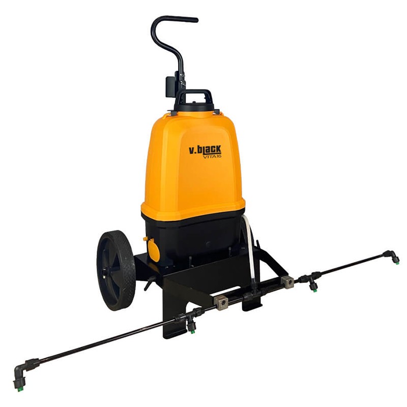 Volpi V.Black VITA 16 est une pompe à chariot avec barre désherbante alimentée par batterie au lithium rechargeable V.Battery , équipée d'une carte électronique avec contrôle de tension capable de maintenir une pression constante pendant toute la durée de vie de la batterie.