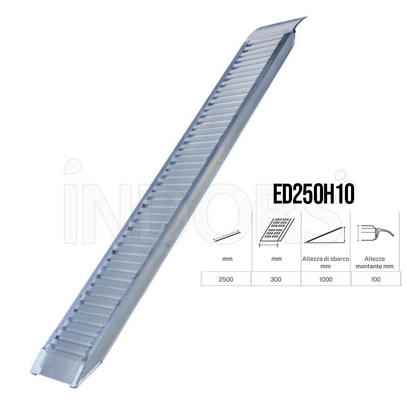 Les rampes en aluminium de 2,50 m modèles ED250H65 , ED250H75 et ED250H10 sont équipées d'une tête standard avec trou central pour l'ancrage au véhicule.