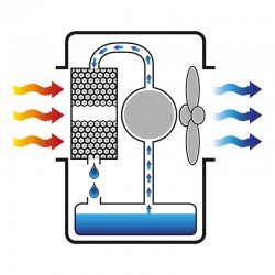 L'air chaud traverse le filtre évaporatif et est chargé d'humidité provenant de l'eau du réservoir ; l'air est refroidi, purifié, puis distribué dans toute la pièce.