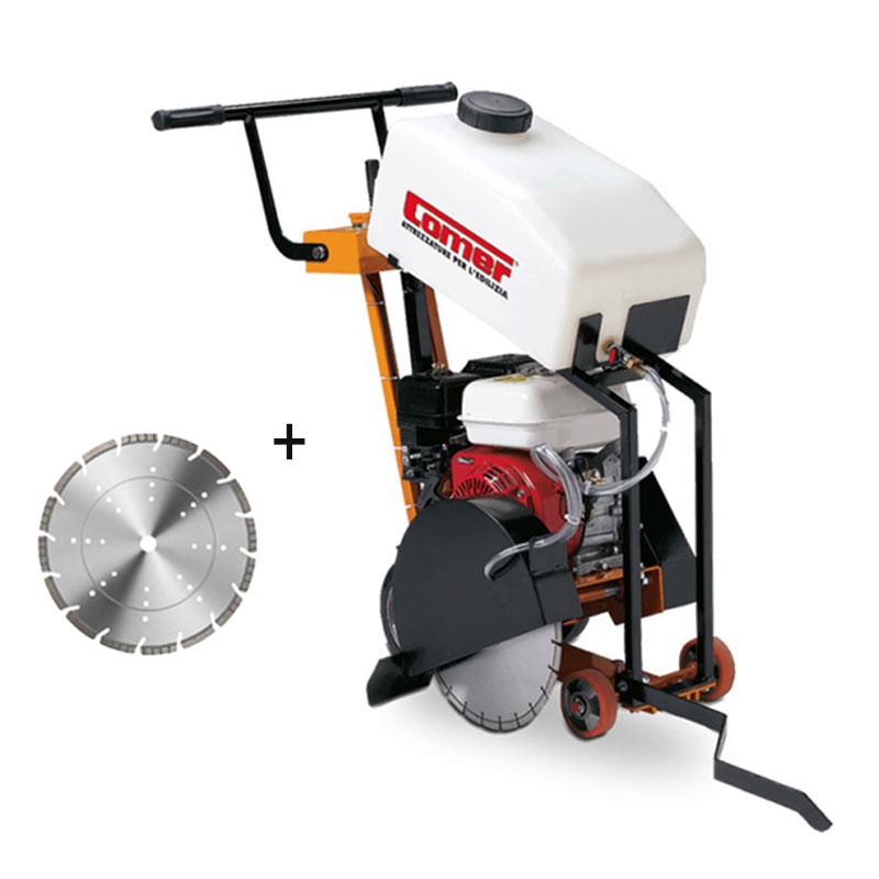 La tondeuse Comer Pavecut 350 est équipée d'un moteur essence disponible en versions Rato R210 4,4 kW (6 ch) , Kohler CH270 5,2 kW (7 ch) et Honda GX200 4,1 kW (5,5 ch) , garantissant une puissance constante et un démarrage manuel fiable. Ses performances de coupe incluent une profondeur maximale de 130 mm , grâce à une lame de 350 mm avec un accessoire de 25,4 mm et une avance par poussée offrant un contrôle optimal. Le réservoir d'eau de 28 litres maintient la lame à une température basse et propre, tandis que son poids de 63 kg assure une grande stabilité sans compromettre sa facilité de transport.