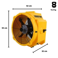 Le châssis de ce circulateur d'air Master est revêtu de peinture en poudre et bénéficie d' une protection IP44 . Ses dimensions sont de 52 x 32 x 55 cm et son poids est de 12,6 kg .