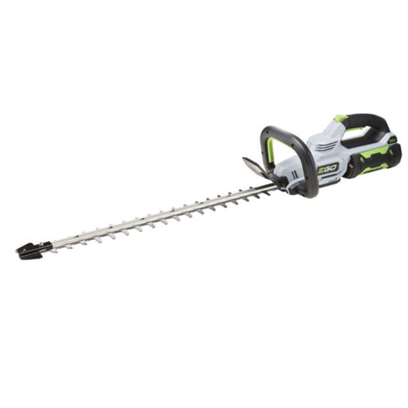 Ce taille-haie EGO est doté de lames à double action , avec des lames découpées au laser et rectifiées au diamant . Avec protection du tranchant de la lame et protection de sécurité pour les lames .