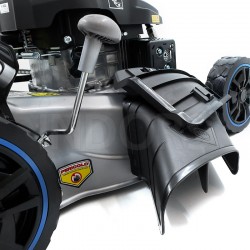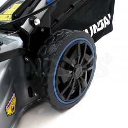 Cette tondeuse à gazon Hyundai est équipée de roues pour faciliter le transport et la manipulation.