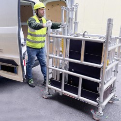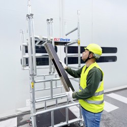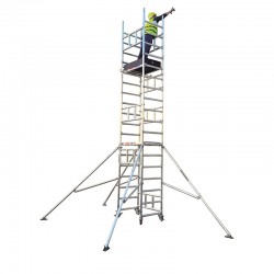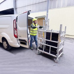 Avec une base de 74 x 160 cm, il est composé d' unités modulaires au choix, de 2,37 m à 7,77 m, avec une hauteur de travail maximale de 8,27 m. Grâce à cette configuration , un seul opérateur peut l'assembler en toute sécurité en moins de 10 minutes, sans avoir à se mettre à terre pendant le montage.
