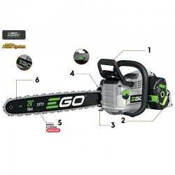 Cette tronçonneuse EGO, référence 060580, est équipée d'un tendeur de chaîne sans outil. Elle possède également un protège-main avec frein de chaîne.